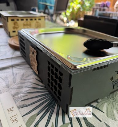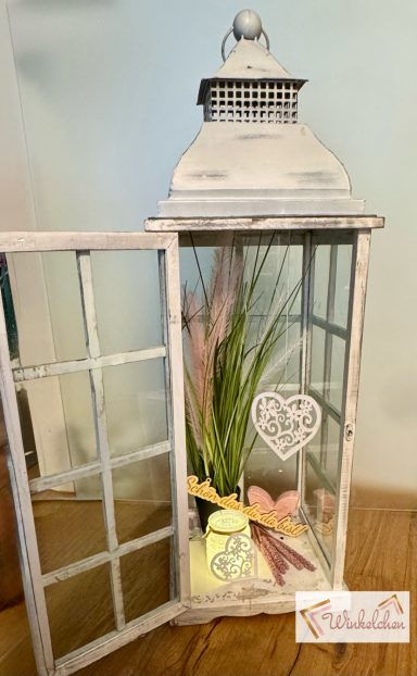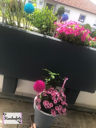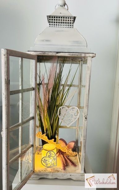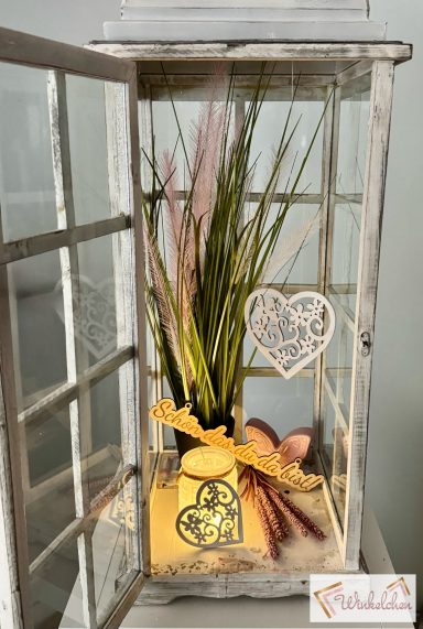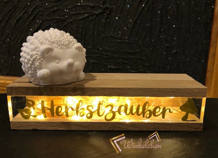 Eine tolle Kombi aus Holztellerchen, Gießkeramik mit Trockenblumen und mit einer Minilichterkette kann die Figur beleuchtet werden.