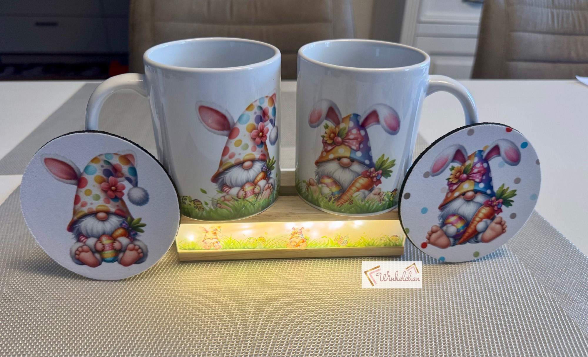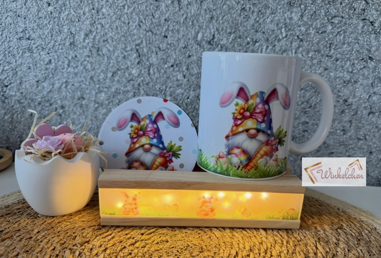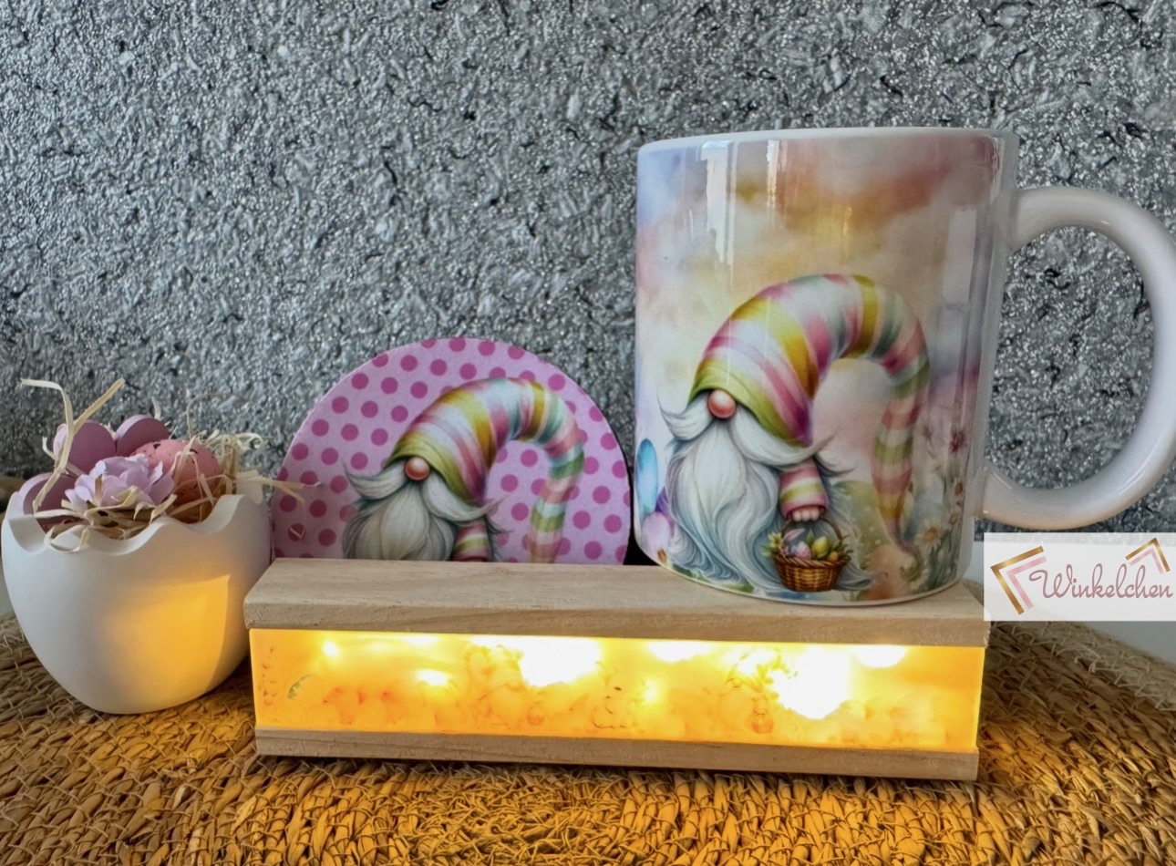 Eine tolle Kombi aus Holztellerchen, Gießkeramik mit Trockenblumen und mit einer Minilichterkette kann die Figur beleuchtet werden.